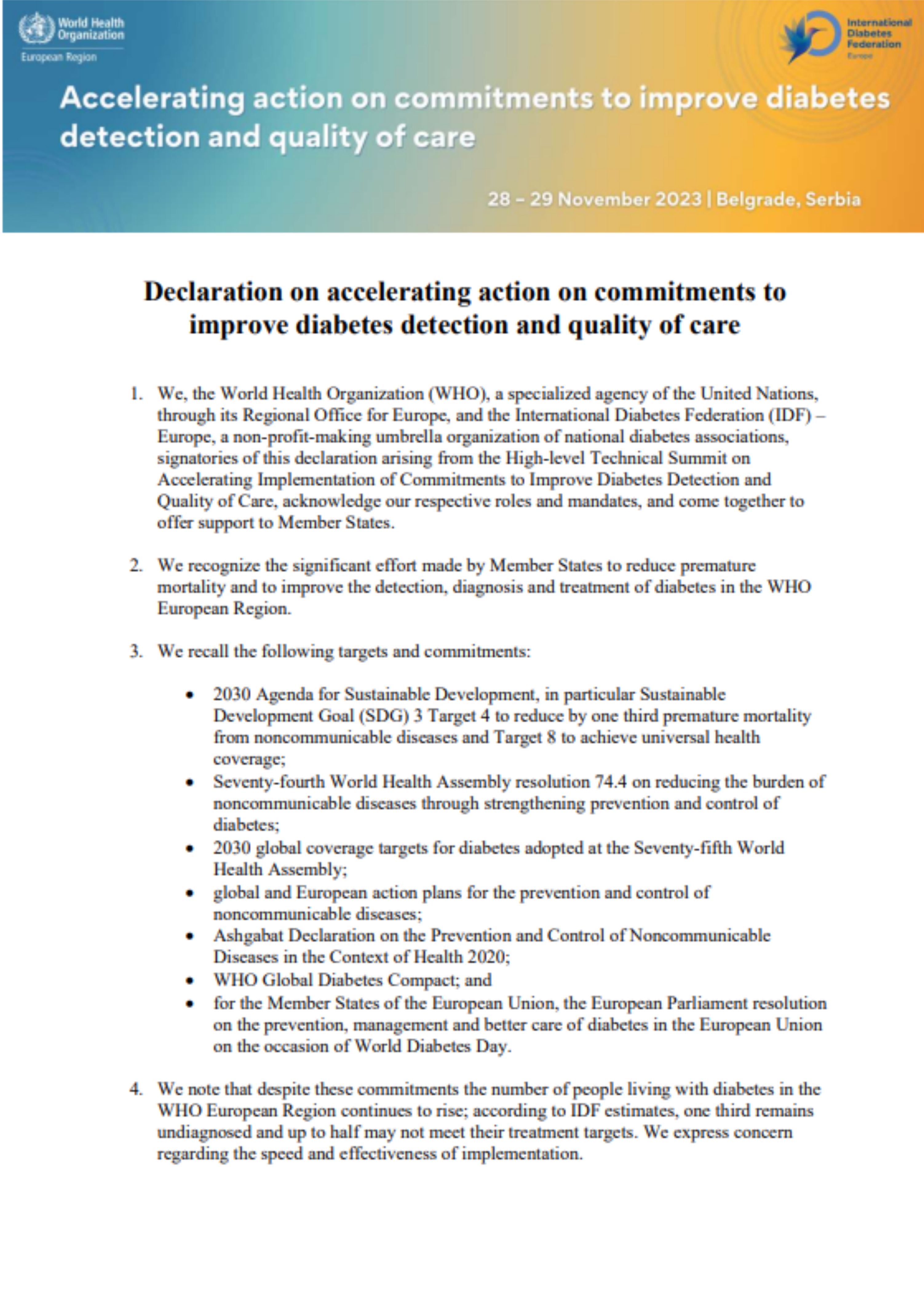 The document is written from the perspective of people living with diabetes (PwD) in Europe and contains recommendations of actions to be implemented to improve their quality of life. These recommendations are articulated around three key pillars: risk reduction, integrating care and enabling access. The action plan is supported by three cross-cutting ‘enablers’: engagement of PwD, digital transformation of healthcare and investment in research.